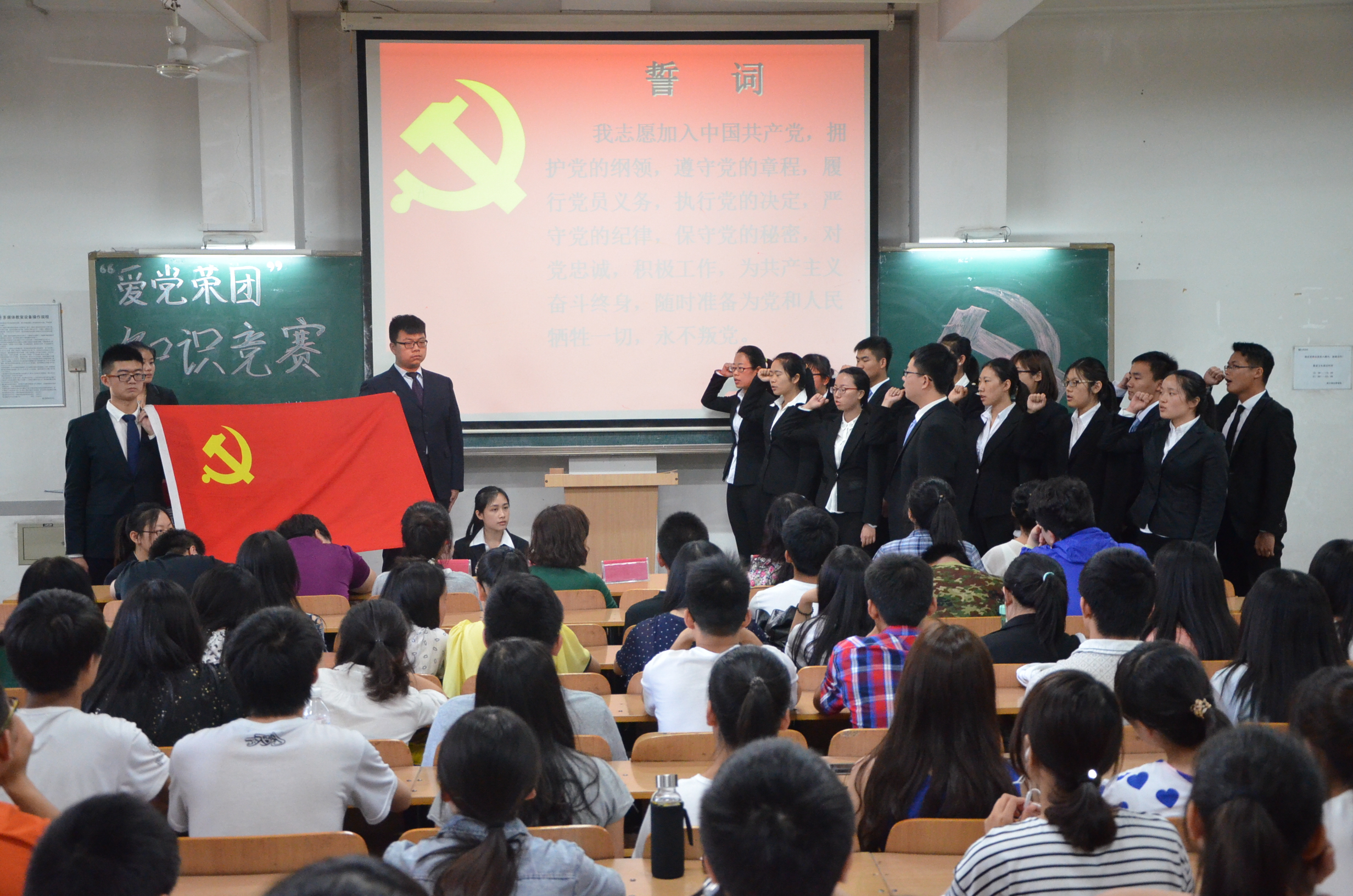 5月20日,伟德国际victor1946爱党荣团知识竞赛暨新党员入党宣誓仪式在3号教学楼118室举办,伟德国际victor1946辅导员孙瑶、沈洁、仉雅琼老师及2013级研究生党支部书记石慧、第三员工党支部书记武杭出席并担任竞赛评委。2014级近200名同学参加本次活动。