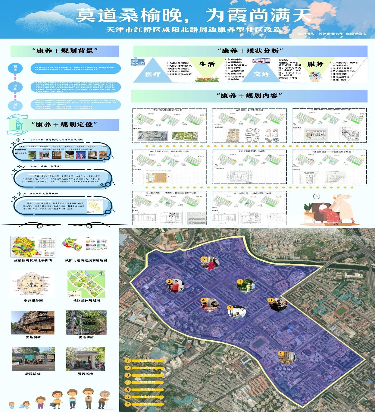 该作品基于旧城改造、城市更新的趋势下,将规划对象聚焦于天津市红桥区咸阳北路街道,结合区位分析、SWOT分析和街角分析等多角度分析手段,从房屋修缮、市政基础设施提升、综合整治、强化管理四个方面进行老旧小区改造升级,在此基础上运用康养理念、构建“7+1+N”康养模式以及“一心、两轴、多节点”的空间布局,从而更好地应对老龄化挑战。